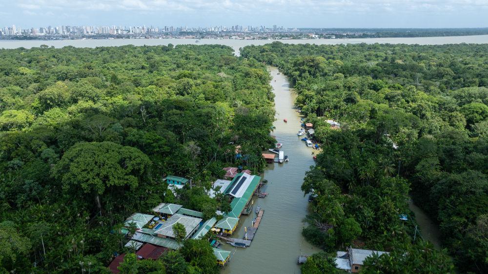 這是11月16日在巴西北部城市貝倫拍攝的熱帶雨林和河道(無人機(jī)照片)。新華社記者 王天聰 攝