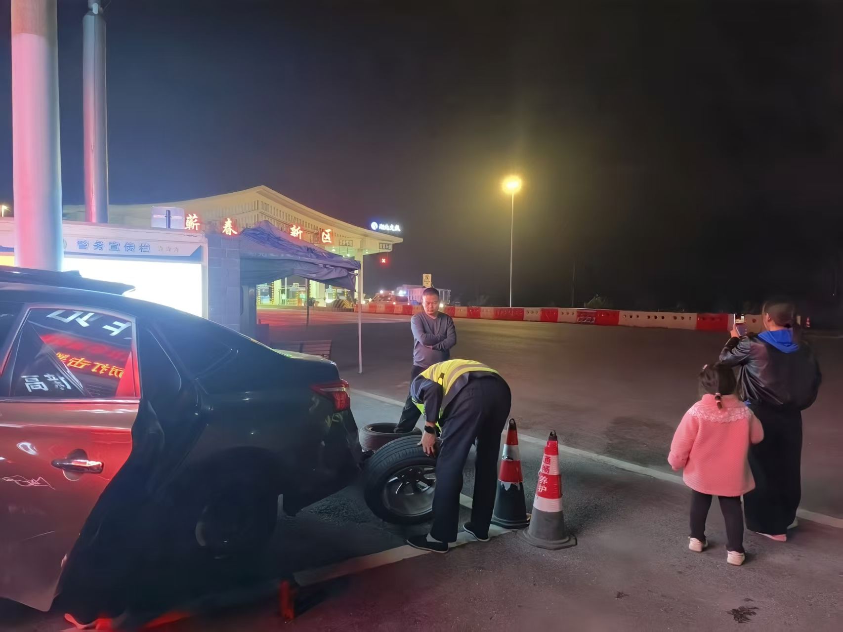 11月17日傍晚,湖北交投鄂東高速蘄春高新區(qū)收費(fèi)站入口處,王女士駕車帶兩名孩子返程黃石時(shí)遭貨車追尾,車輛受損無法行駛。危急時(shí)刻,收費(fèi)站工作人員及時(shí)介入,通過安撫情緒、安置孩子、更換備胎等暖心舉措,幫母子三人化解困境順利返程。