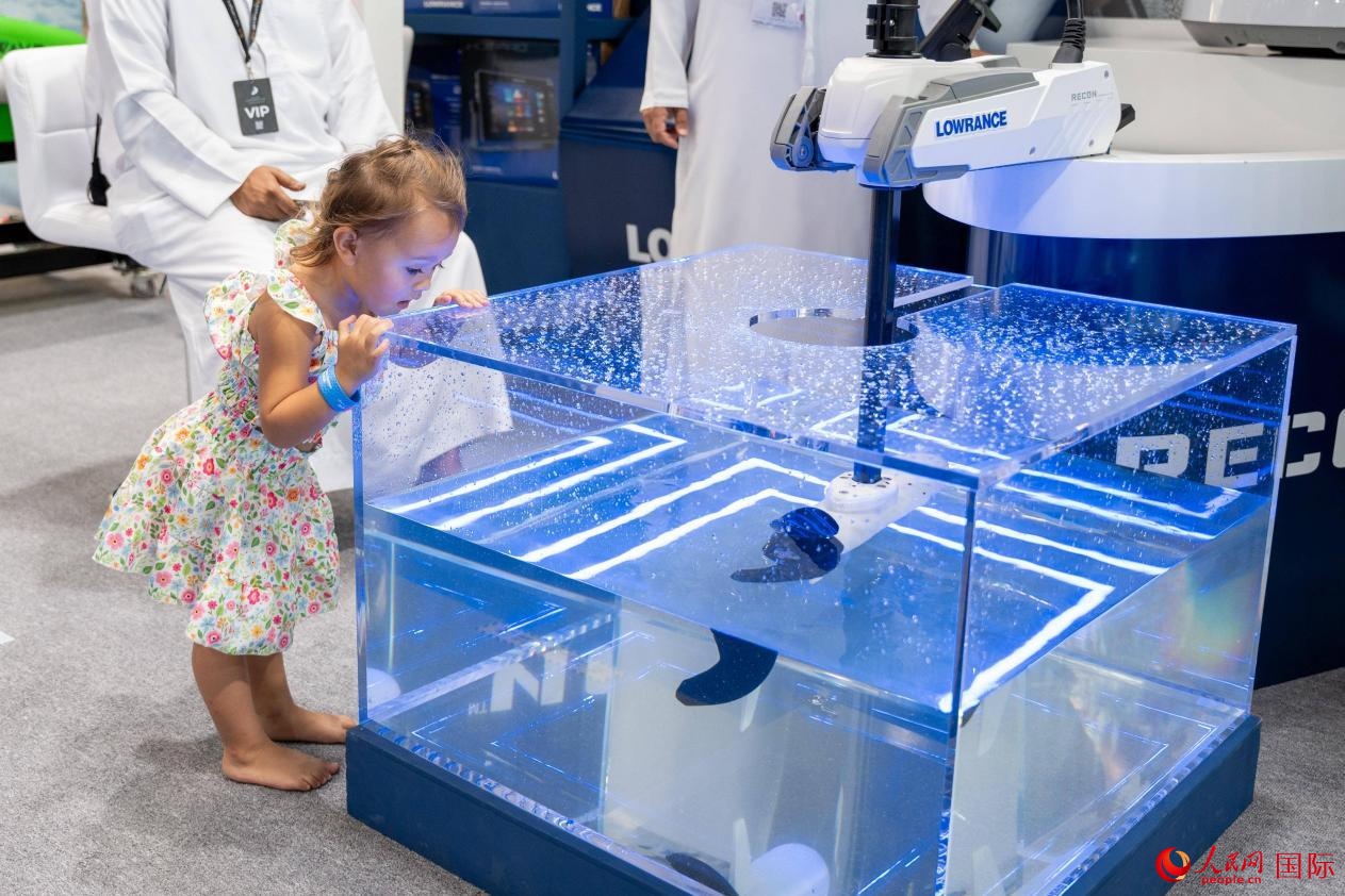 一位小觀眾在了解釣魚裝備。人民網(wǎng) 塔里克·易卜拉欣攝
