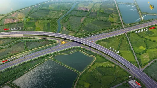 據(jù)項目技術(shù)負(fù)責(zé)人介紹,全線按照雙向六車道標(biāo)準(zhǔn)建設(shè),其中8.581公里已建成通車,剩余10.818公里新建段正全力推進。值得一提的是,道路在G107段采用菱形互通設(shè)計,主線高架橋上跨,確保交通暢通;跨仙女湖段則采用環(huán)保施工工藝,最大限度保護水域生態(tài)。項目建成后,從孝感主城區(qū)到武漢天河機場僅需30分鐘,到陽邏港也將實現(xiàn)快速直達。