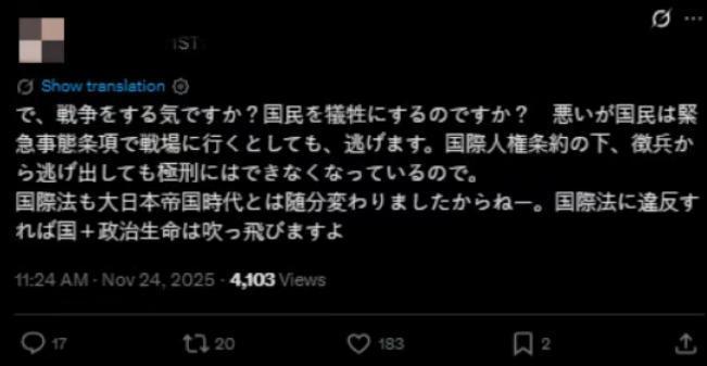 一些日本網(wǎng)友憤慨地留言道:“(高市政權(quán))是執(zhí)意要發(fā)動戰(zhàn)爭嗎?是準備讓民眾去當‘炮灰’嗎?任何違反國際法的行為,都將導致該國及其決策者的政治生命徹底終結(jié)。”