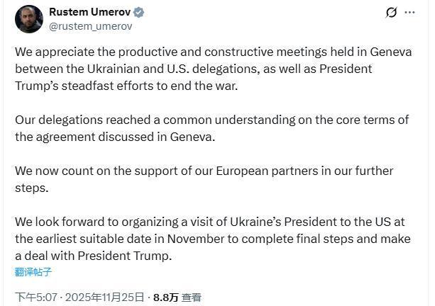 烏克蘭國家安全與國防委員會秘書烏梅羅夫則于同日在社交媒體上公開表態(tài)稱,美烏雙方代表團(tuán)已就在日內(nèi)瓦討論的協(xié)議的核心內(nèi)容上,達(dá)成一致。