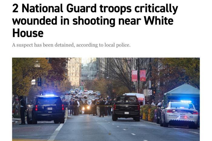 據(jù)警方官員稱,國(guó)民警衛(wèi)隊(duì)成員當(dāng)時(shí)正在執(zhí)行巡邏,突然遭到槍擊。警方還稱,現(xiàn)場(chǎng)已得到控制,涉嫌開(kāi)槍者已被“制服”并被拘捕,但同時(shí)建議民眾避開(kāi)該區(qū)域。