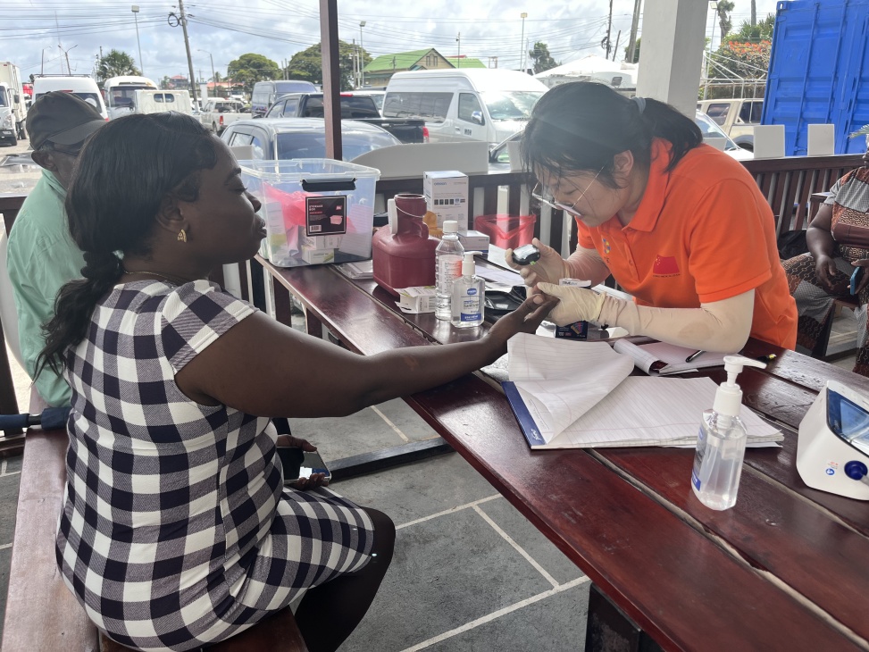 援圭亞那中國醫(yī)療隊隊員為當(dāng)?shù)孛癖娺M行血糖檢測。第21批援圭亞那中國醫(yī)療隊供圖