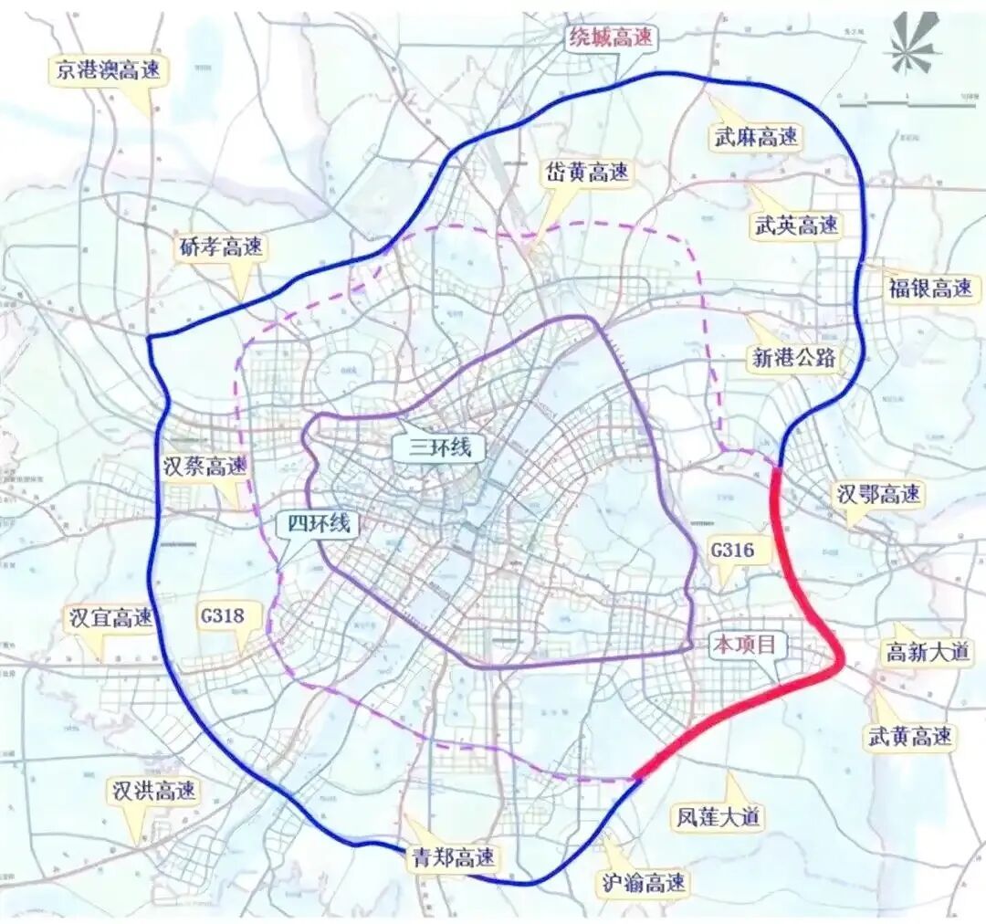 紅色路段為武漢繞城高速與四環(huán)線共用路段