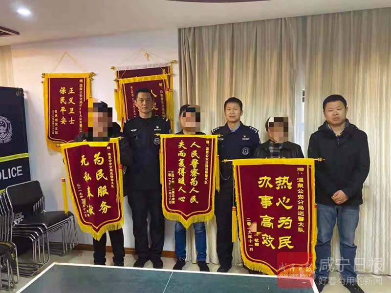 咸寧網(wǎng)訊(香城都市報(bào)記者 方達(dá)星 通訊員 胡微) 11月18日上午,山東騰州的楊先生、浙江上虞的倪女士以及江西上饒的張先生三人,將三面錦旗送到溫泉巡特警手中。他們連連道謝,感激之情溢于言表。
