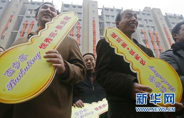 這是首批住戶代表在武漢市最大的保障性住房項目——百步亭社區(qū)悅秀苑、景蘭苑交房儀式上領到鑰匙(2009年12月8日攝)。 新華社發(fā)